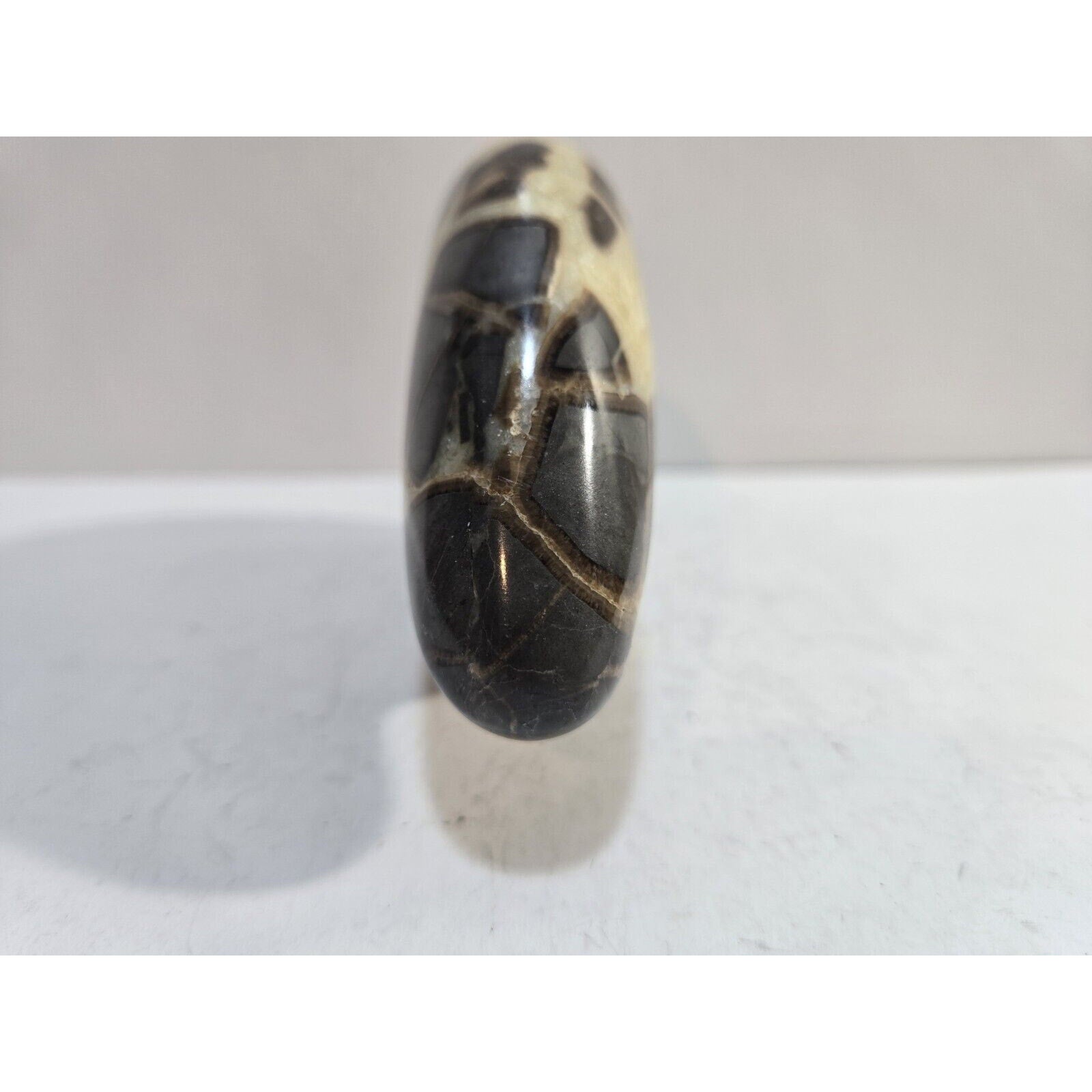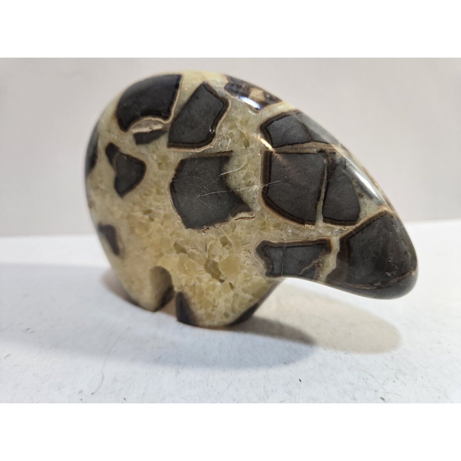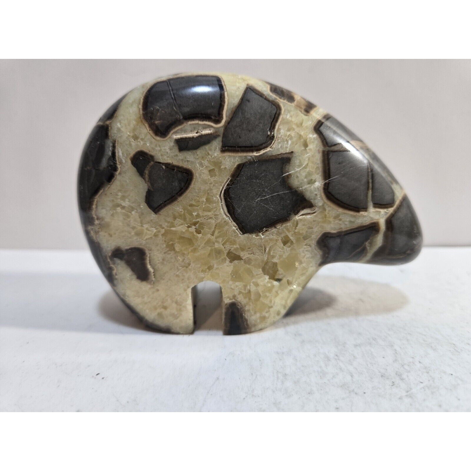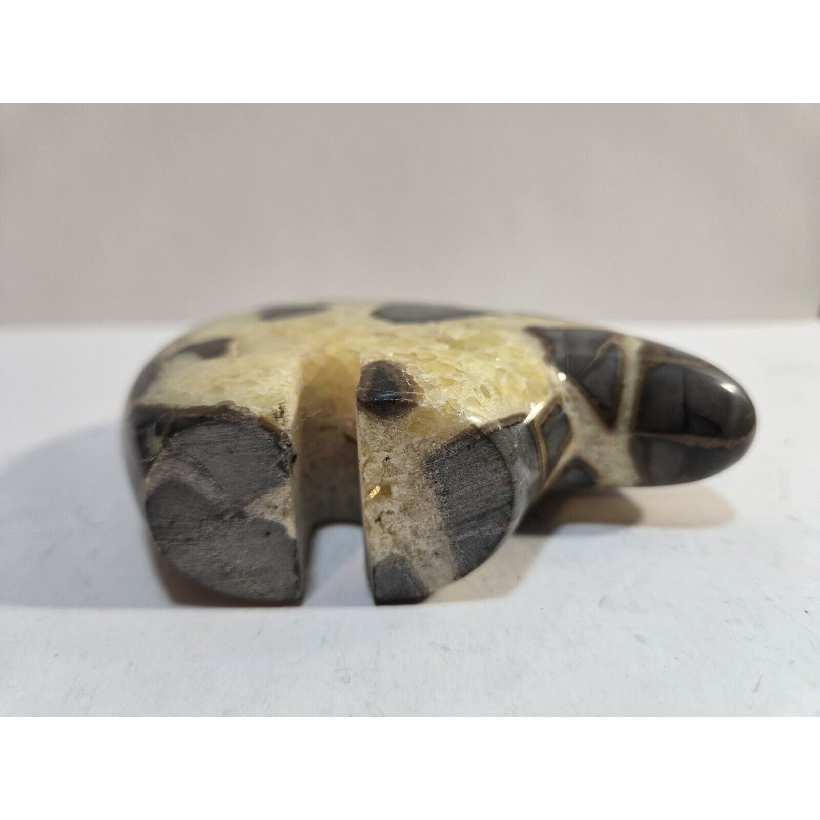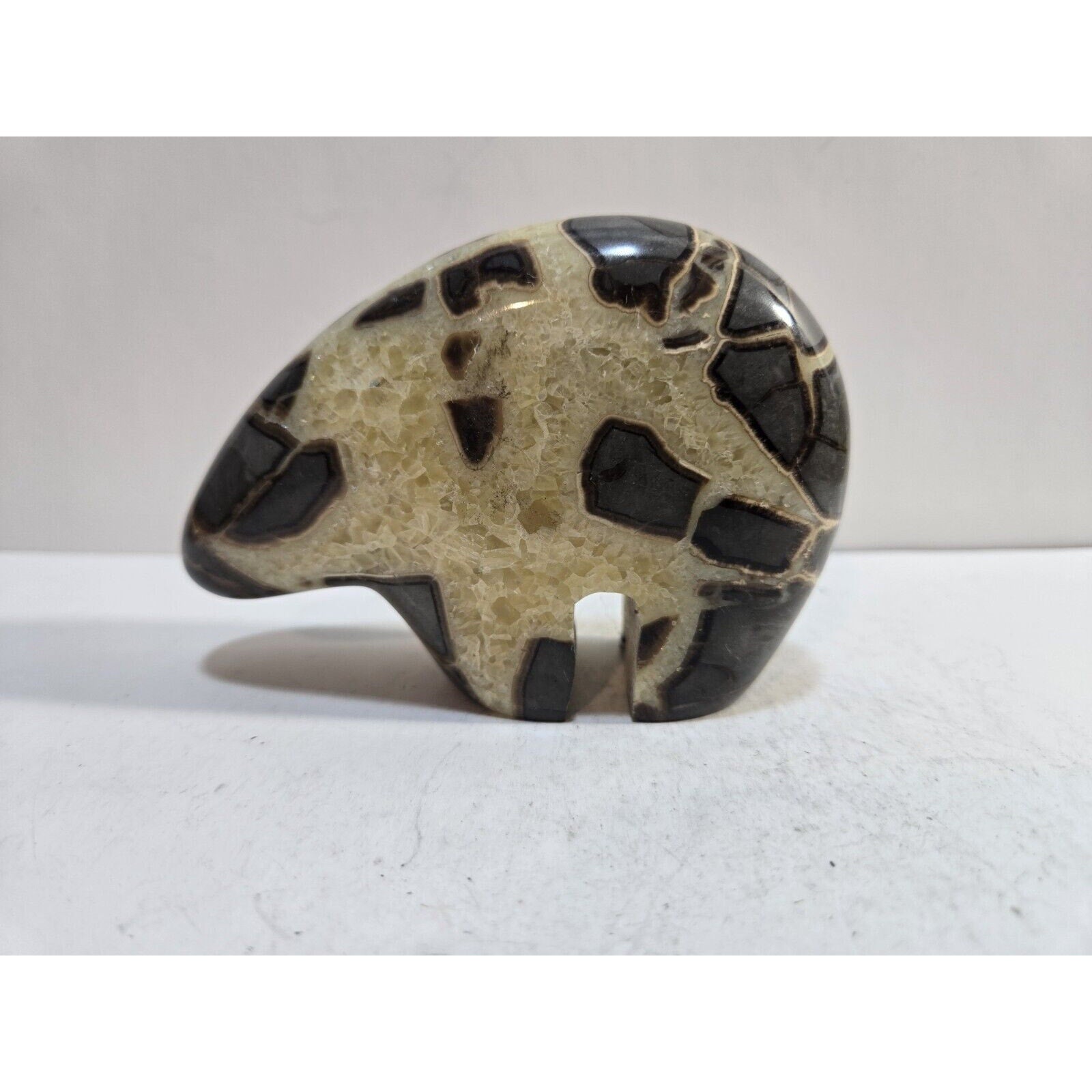 This beautiful crystal bear is a must-have for any collector or lover of unique and fascinating items. Made from septarian druzy, this 4-inch bear is a true work of art. Its intricate details and vibrant colors make it a standout piece that is sure to impress. Crafted in the United States, this bear is a rare find that is perfect for display in any home or office. Its unique features, including its country of origin, make it a great addition to any collection of stone carvings, rocks, fossils, and minerals. Don't miss out on the opportunity to own this one-of-a-kind item.