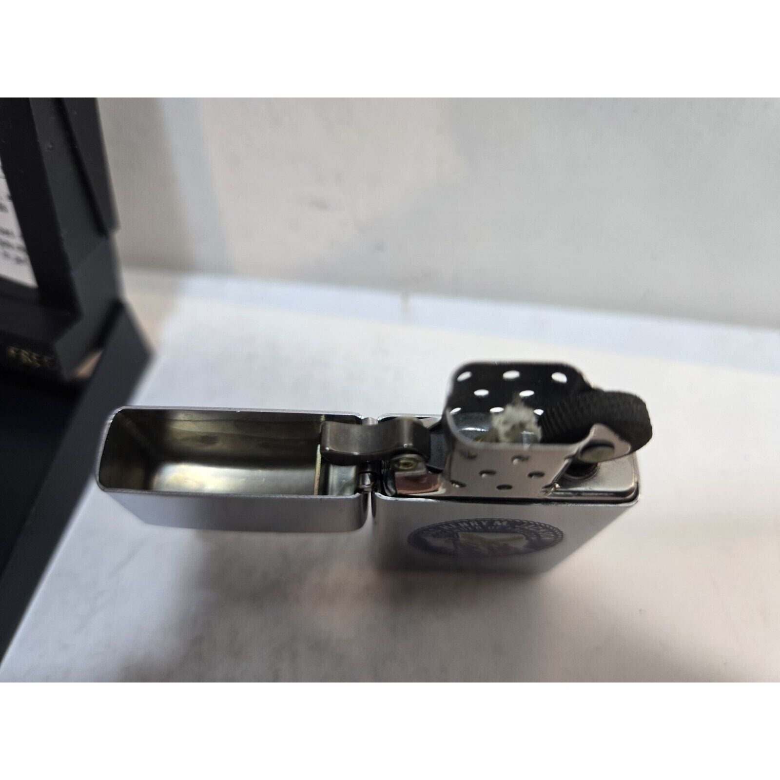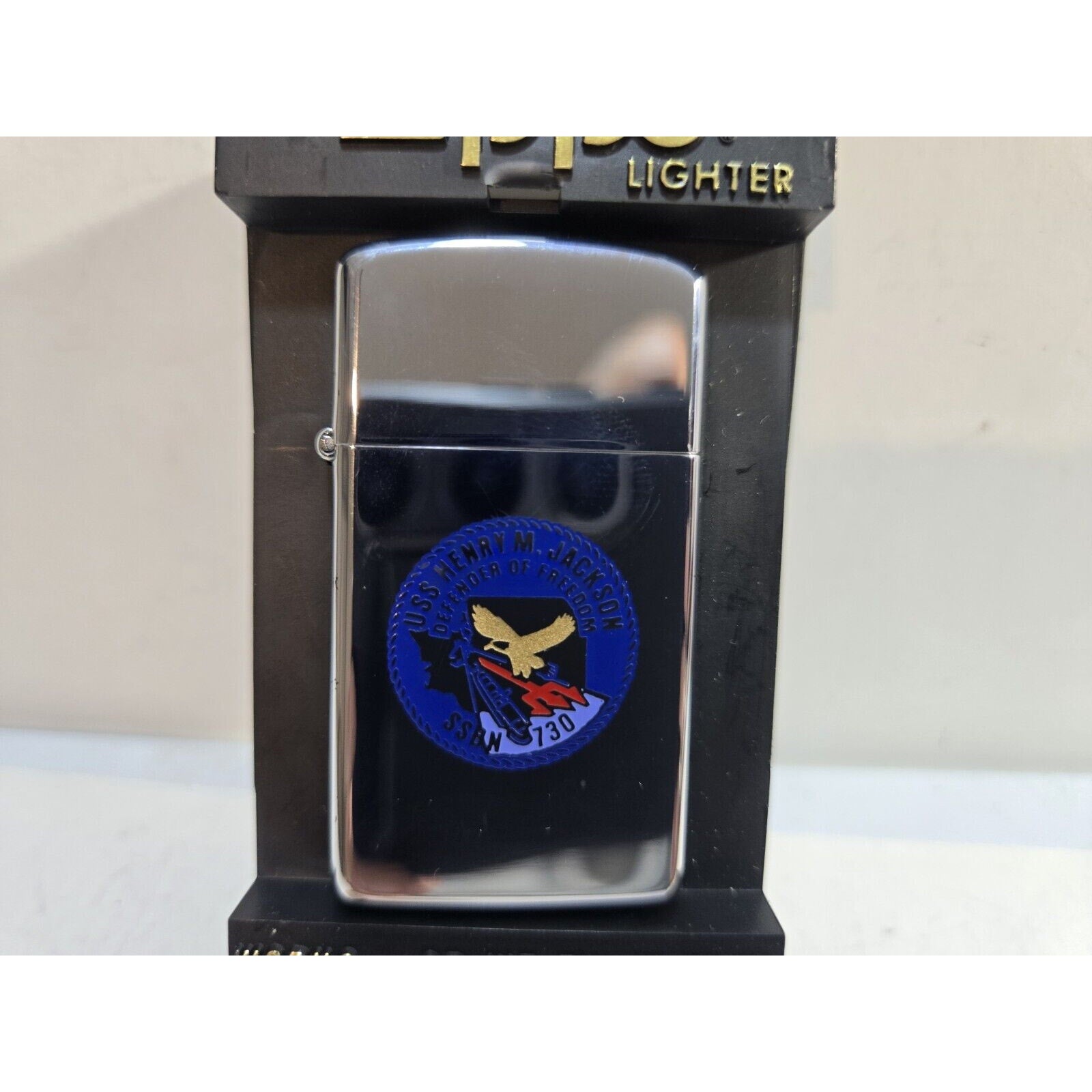UNLIT This is a NOS vintage Zippo lighter with a military theme. The design features the USS HANRY JACKSON SSBN 730 and comes with the original box. The lighter is made in the United States and is in working condition.