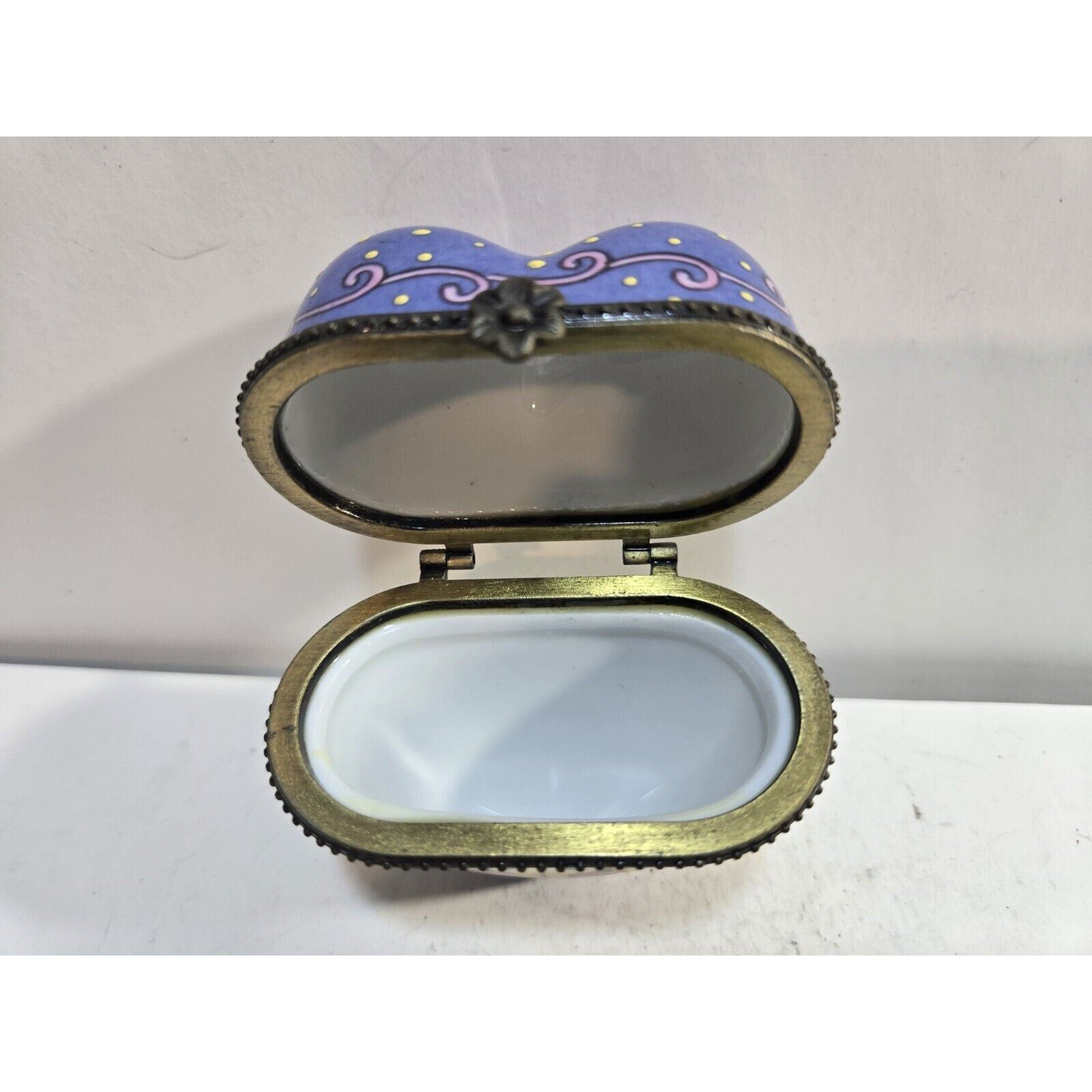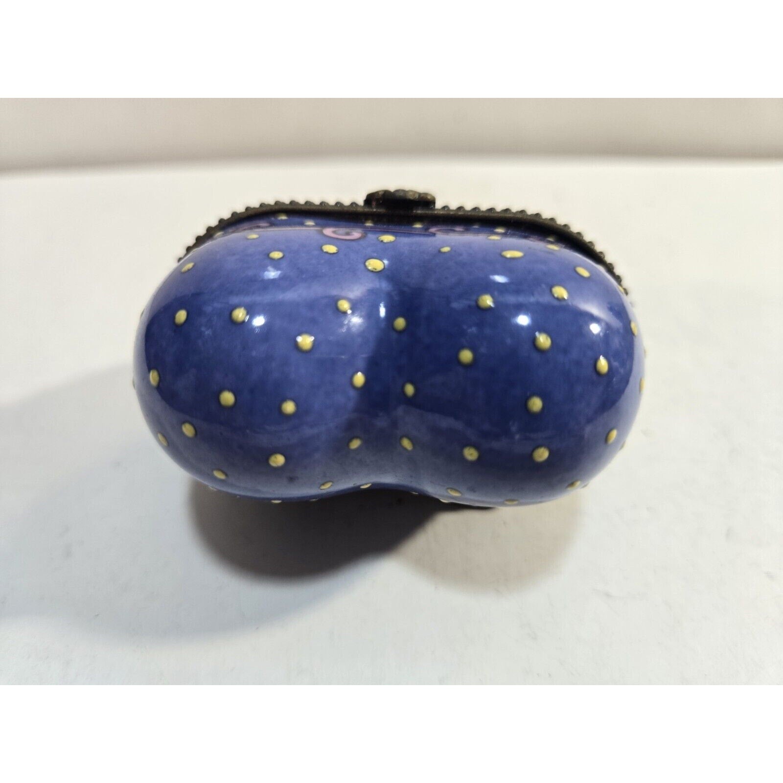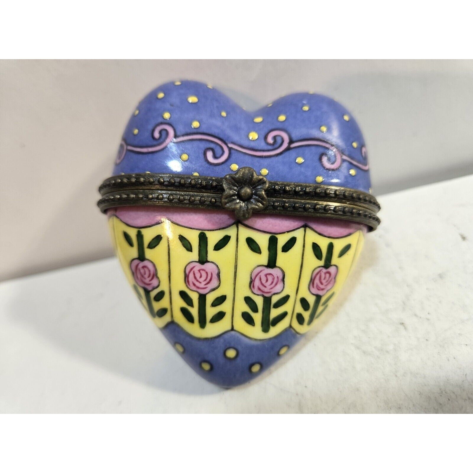 This beautiful trinket box is a must-have for any collector or lover of porcelain. The heart-shaped design features a lovely rose pattern in shades of pink and blue, making it a perfect addition to any decor. The box has a hinged lid and is made with high-quality porcelain material. It is a boxed item and has not been modified in any way. The box is perfect for storing small items or trinkets, and its unique design is sure to be a conversation starter. The country/region of manufacture is unknown, but the box has been crafted with care and attention to detail. Add this lovely trinket box to your collection today!